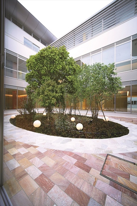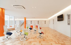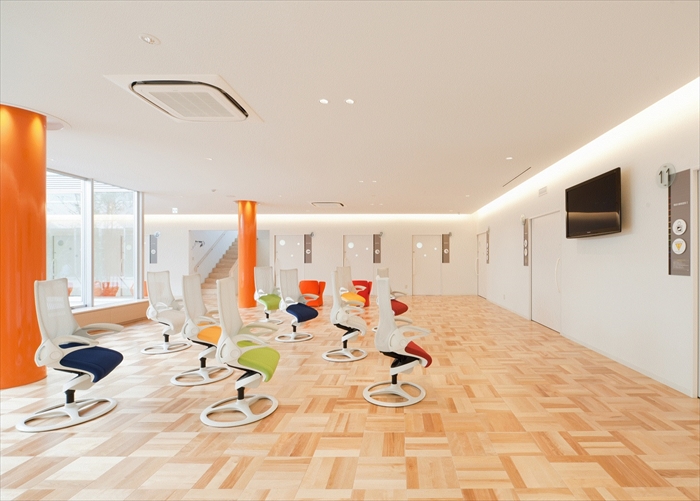 ぎふ綜合健診センターでは、一般的な医療施設とは雰囲気の異なる空間づくりをしています。ガラス張りの建物に入ると、カラフルな柱や椅子に出会います。施設内が明るさに満ちているのは、中庭があり自然の光が入るから。樺のフローリングも心地よく、リラックスしてくつろぐことのできる空間が心に余裕をもたらします。